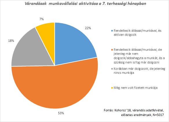 Válaszaik alapján azt mondhatjuk, hogy a magyar várandósok terhességük hetedik hónapját már többnyire nem a munkában töltik. A válaszadók mindössze egyötöde, 22%-a dolgozott még ekkor. A többség - a kismamák több, mint fele - ugyan rendelkezett állással, de a várandósság miatt ekkor már otthon volt. Az anyukák 18%-a nem állt foglalkoztatásban a várandósság hetedik hónapjában, további 7%-uknak pedig még egyáltalán nem volt fizetett munkája – utóbbiak többnyire a legfiatalabb korcsoportokat képviselik.