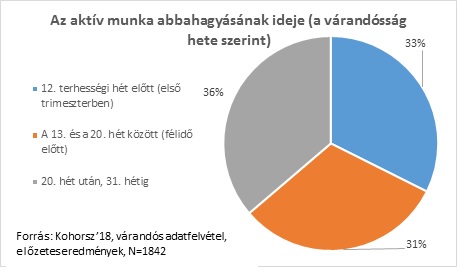 A munkaviszonnyal rendelkező, ám a 7. hónapban zajlott megkereséskor már táppénzen lévő kismamák a munkavégzés megszüntetésének ideje alapján három alcsoportba sorolhatók. Egyharmaduk már az első terhességi trimeszterben (12. hét előtt) otthon marad és nem dolgozik. Ezt követően, de még a várandósság félideje előtt (a 13. és 20. terhességi hét között) további 31%-uk ment el táppénzre. A 7. hónapban járó, táppénzen lévő várandósok 36%-ban a 21. hetet követő időszakban mentek táppénzre munkahelyükről.