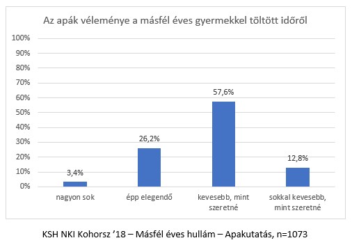 A Kohorsz ’18 kutatás harmadik szakaszában megkérdeztük az apákat, hogy összességében hogyan látják a másfél éves gyermekükkel eltöltött idő mennyiségét. Válaszaik alapján a gyermekkel töltött idő többnyire, a megkérdezettek 70%-a számára kevesebb, mint szeretné.