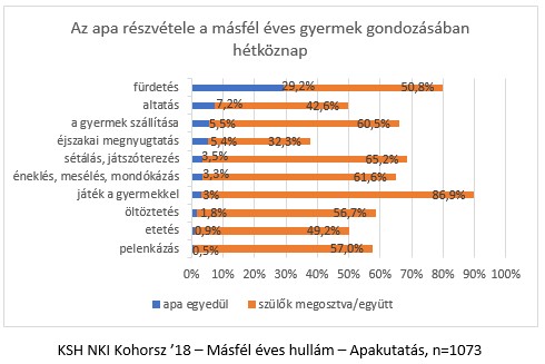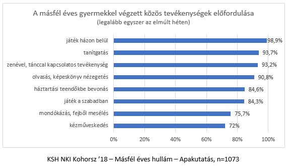 Az apák legnagyobb arányban a másfél éves gyermekkel folytatott házon belüli játékról, a gyermek tanítgatásáról, a vele közös zenés vagy táncos aktivitásról és a közös olvasásról számoltak be. Ezeket a tevékenységeket szinte mindenki (min. 91%) legalább egyszer végezte gyermekével a kérdezést megelőző héten.