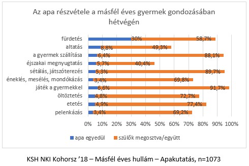Viszont az apák közel háromegyede (71 százaléka) hétvégéken a kutatásban vizsgált legtöbb tevékenységnél már az anyákkal együtt jelen van, szemben a hétköznap megfigyelt 56%-kal. Azokban a tevékenységekben szinte mindegyik megkérdezett apa részt vesz partnerével együtt, amelyek a hétvégi szabadidőhöz kapcsolódnak, vagyis a közös játékba (92%), a sétálásban, játszóterezésbe (90%) és a gyermek szállításába (88%). Emellett a hétköznapokhoz képest jelentősen magasabb, 73-77 százalékos gyakorisággal fordul elő az anyával közösen végzett öltöztetés és etetés.