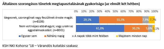 Az anyák általános szorongásait két állítás segítségével mértük fel, afelől érdeklődve, hogy milyen gyakran tapasztaltak az elmúlt két hétben bizonyos tüneteket. A várandósok többsége legfeljebb néhány napig tapasztalt szorongást, két héten belül, 15,6 százalékuk azonban arról számolt be, hogy az idő nagyobb részében idegesnek, szorongónak vagy feszültnek érezte magát, 8,7 százalékuk pedig az idő nagyobb részében szüntelenül aggodalmaskodott. A szorongásos tünetek az átlagosnál jelentősen gyakrabban fordultak elő a partner nélkül élő, a legalább negyedik gyermeküket váró, a rossz anyagi helyzetben élő, a 24 évnél fiatalabb, a legfeljebb alapfokú végzettségű, és a várandósságot nem, vagy pedig későbbre tervező anyák körében.