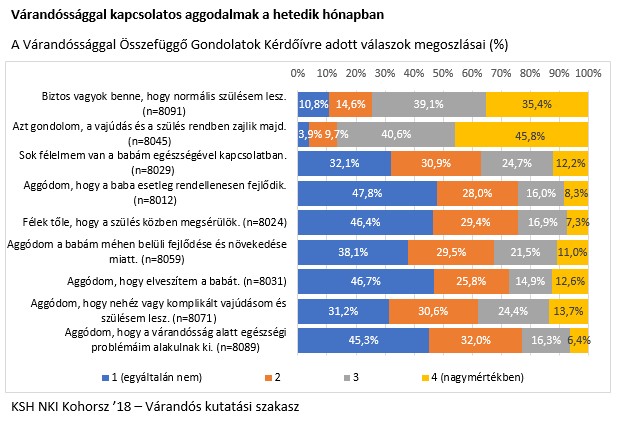 A válaszadók várandóssággal összefüggő szorongásait, félelmeit egy kilenc tételes kérdőív segítségével mértük fel, amely a magzat egészségével és esetleges elvesztésével, az anya egészségével, a szüléssel, a gyermek gondozásával és a kontrollal kapcsolatos aggodalmak felmérésére alkalmas. Az anyákra összességében kismértékű várandóssággal összefüggő aggodalmak voltak jellemzőek. Ami a három leggyakrabban előforduló aggodalmat illeti, a várandósok 38,2 százaléka aggódott, hogy nehéz vagy komplikált vajúdása, vagy szülése lesz, 37 százalékuknak voltak a baba egészségével kapcsolatos félelmei és 32,4 százalékuk aggódott a baba méhen belüli fejlődése miatt.