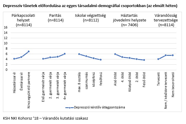 Végül, a depressziót valószínűsítő tünetek előfordulását egy nyolc tételes kérdőív segítségével mértük fel, a kérdezést megelőző hétre vonatkozóan. Ennek eredménye alapján a várandósok átlagosan nagyon alacsony gyakorisággal tapasztaltak depresszióra utaló tüneteket. A várandósság alatti depresszív tünetek (az ezt felmérő kérdőív összpontszámának eltérései alapján) ritkábban fordultak elő azoknál, akik házasságban éltek, első gyermeküket várták, valamint magasabb iskolai végzettség, magasabb jövedelem és a várandósság tervezettsége esetén.