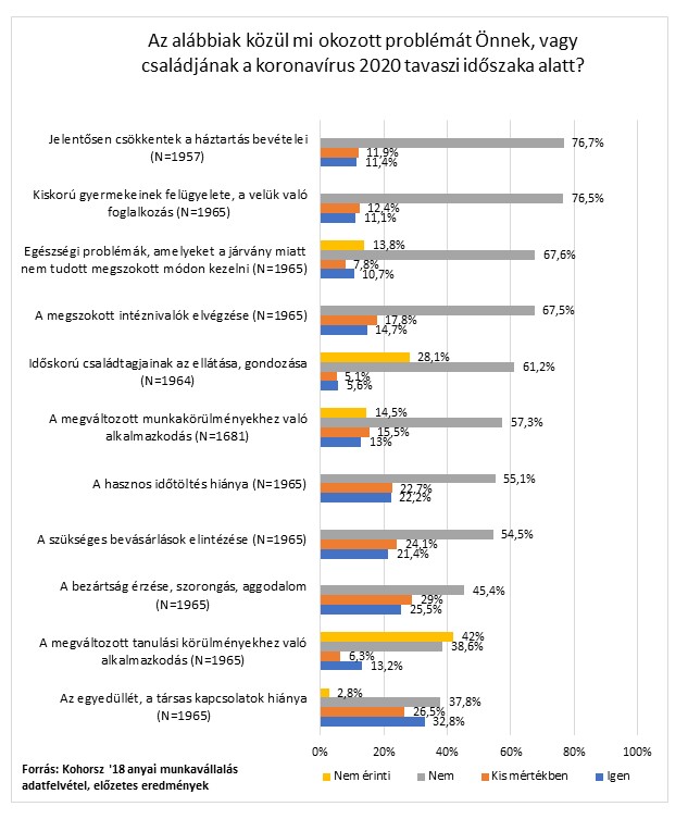 A koronavírus járvány magyarországi megjelenése óta számos, az élet szinte minden területét érintő intézkedést és korlátozást vezettek be. Bár a kutatásban részt vevő, kisgyermeket nevelő anyák többsége (84,5%) a múlt év tavaszi időszakában nem dolgozott aktívan, – mivel a legtöbben ekkor még jogosultak voltak gyes-re, gyed-re vagy gyet-re – számos egyéb olyan tényezővel kellett megbirkózniuk a vírus ideje alatt, amelyek megnehezíthették a mindennapi életüket. A válaszadók legnagyobb hányada (32,8%) számára az egyedüllét, illetve a társas kapcsolatok hiányának kezelése jelentett egyértelmű problémát, kismértékben pedig további 26,5 százalékuk küzdött ezzel. Sokan (54,5%) említették még emellett a bezártság-érzés, a szorongás, illetve a vírussal kapcsolatos aggodalmak negatív hatását.