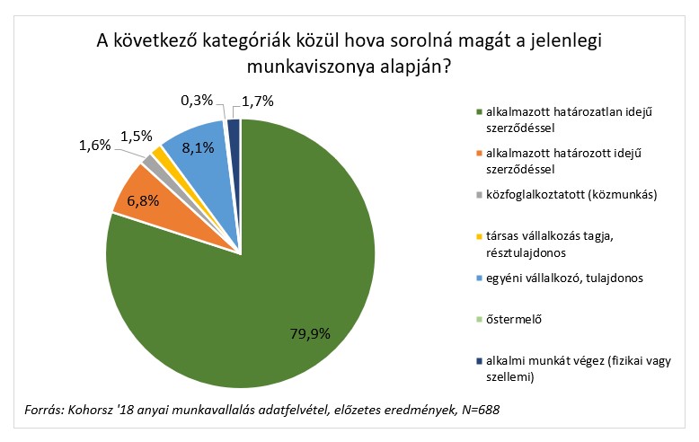 A munkaerőpiacra visszatérő anyák több mint fele (56,2%) teljes mértékben magántulajdonú cégnél, 37,6 százalékuk állami vagy önkormányzati tulajdonban lévő munkahelyen dolgozik. A válaszadók döntő többsége (79,9%) alkalmazottként dolgozik, határozatlan idejű szerződéssel, őket követik az egyéni vállalkozók, tulajdonosok (8,1%), majd az alkalmazottak határozott idejű szerződéssel (6,8%).