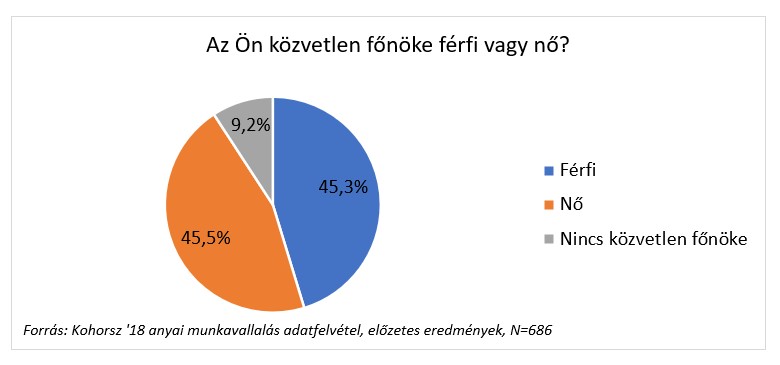 Nagyobb változatosság figyelhető meg az egyes munkahelyek között a foglalkoztatottak száma szerint. A megkérdezettek 27,3 százaléka olyan helyen vállalt munkát, ahol kevesebb, mint 10 embert foglalkoztatnak, 26,6 százalékuk azonban olyan munkahelyen dolgozik, ahol akár 500 főnél is magasabb a létszám. A válaszadó anyák 18,4 százalékának 25 és 99 fő közé, 16 százalékának 100 és 499 fő közé, 11,7 százalékának pedig 10 és 24 fő közé esik a munkahelyén a foglalkoztatottak száma. Hasonlóan változatos képet mutat a munkavállalók közvetlen főnökének nemek szerinti megoszlása. Közel fele-fele arányban vannak jelen férfi és női (közvetlen) vezetők.