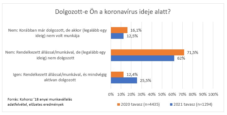 A koronavírus következtében meghozott intézkedések és korlátozások első bevezetésekor, 2020 tavaszán, az akkor másfél-kétéves gyermeket nevelő anyák többsége (71,5%), bár rendelkezett munkahellyel, azonban (legalább egy ideig) nem dolgozott. Ennek egyik fő oka, hogy a legtöbben ekkor még gyes-en, gyed-en vagy gyet-en voltak. A válaszadók 16,1 százaléka, bár a szülést követően valamikor már dolgozott, a koronavírus 2020. tavaszi időszakában azonban (legalább egy ideig) nem volt munkahelye. Ezeknek az anyáknak 1,6 százaléka nyilatkozott úgy, hogy a járvány következtében vesztette el az állását. A válaszadó anyák 12,4 százaléka pedig, már visszament dolgozni a szülés után, és a vírus első hulláma alatt mindvégig aktívan is dolgozott. Hasonló kép rajzolódik ki a vírus harmadik hullámára vonatkozóan is, ahol a válaszadók 62 százaléka bár rendelkezett munkahellyel, (legalább egy ideig) nem dolgozott a járvány ezen időszakában, 12,5 százalék pedig a szülés után már munkát vállalt valamikor, de 2021 tavaszán (legalább egy ideig) nem dolgozott. Közülük 3,2 százalék állította azt, hogy a járvány miatt vesztette el munkáját. A harmadik hullám alatt az anyák 25,5 százaléka dolgozott mindvégig aktívan. Az elemzés a továbbiakban a járvány alatt aktívan dolgozó anyákra fókuszál.