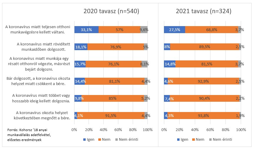 A járvány első hulláma alatt meghozott koronavírussal kapcsolatos intézkedések a másfél-kétéves gyermeket nevelő, de már aktívan dolgozó anyák munkakörülményeit sem hagyták érintetlenül. A leginkább jellemző változás, hogy sokaknak teljesen (33,1%) vagy legalább részben (15,7%) otthoni munkavégzésre kellett átállnia. A munkaidő megváltozása is gyakori volt: 18,1 százalék volt azok aránya, akik azt mondták, hogy a járvány miatt rövidített munkaidőben kellett dolgozniuk, ezzel szemben a válaszadók 9,8 százaléka nyilatkozott úgy, hogy munkaideje éppen hogy megnőtt a korlátozások ideje alatt. A fizetések tekintetében a dolgozó anyák 14,4 százaléka tapasztalt bércsökkenést, 4,1 százazalékuknak azonban megnövekedett a bére a kijelölt időszakban. Hasonló tendencia tapasztalható azon anyák körében is, akik a járvány 2021 tavaszi időszakára vonatkozóan válaszoltak. A megkérdezettek 27,5 százaléka váltott teljesen otthoni munkavégzésre, további 14,8 százalék pedig legalább részben, de otthonról dolgozott a járvány következtében. Az anyák 7,4 százaléka esetében fordult elő, hogy a harmadik hullám ideje alatt többet, vagy hosszabb ideig kellett dolgoznia, 8 százalékuknál azonban a munkaidő megrövidülése volt jellemző.